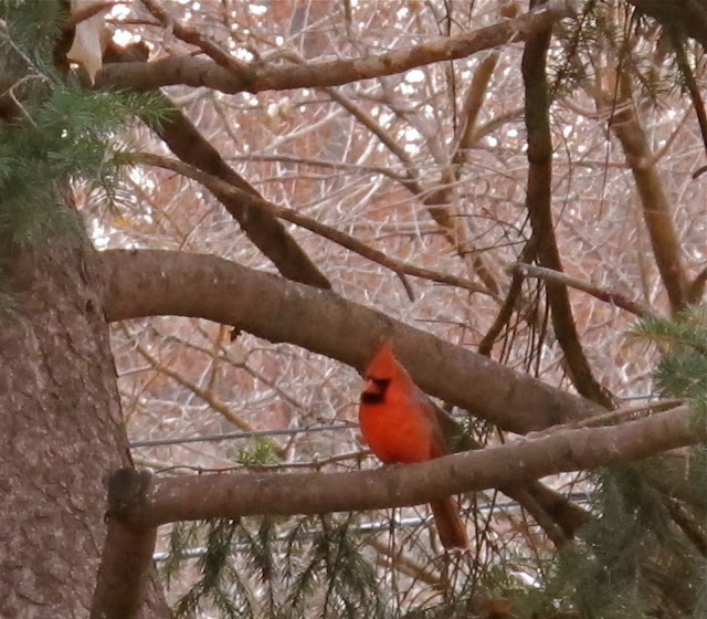 I took a quick walk around the yard and spotted the downy woodpecker at the feeder. I see him often, as well as a flicker. The flicker likes to make his presence known by singing his funny song. I almost got a photo of him but he saw me coming and flew into another tree, obviously irritated. He returned to the feeder after I went inside. I'm always happy to see the cardinals at the feeder. I hear them cheeping when the sun is going down and then again in the morning, outside of the bathroom window. Their happy red color is the best!